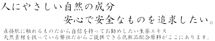 化粧品の配合原料として認められている成分は数千種類におよび、 そのうちアレルギーなどの原因となる化学物質は 約100種類存在します。 その成分が何のために添加されているのか? 安全性はどうなのか? そのような消費者か らの不安を解消するため現在では医薬部外品を除く全ての化粧品について「全成分表示」が義務づけられています。 近年、化粧品分野において、何を基準に判断できるのか解らないという消費者の疑問と、自然志向の高まりから、植 物成分の利用が急速に進み数多くの生薬エキスが化粧品に配合されています。 ここでは弊社が製造する主な化粧品配合原料を紹介しております。 |
